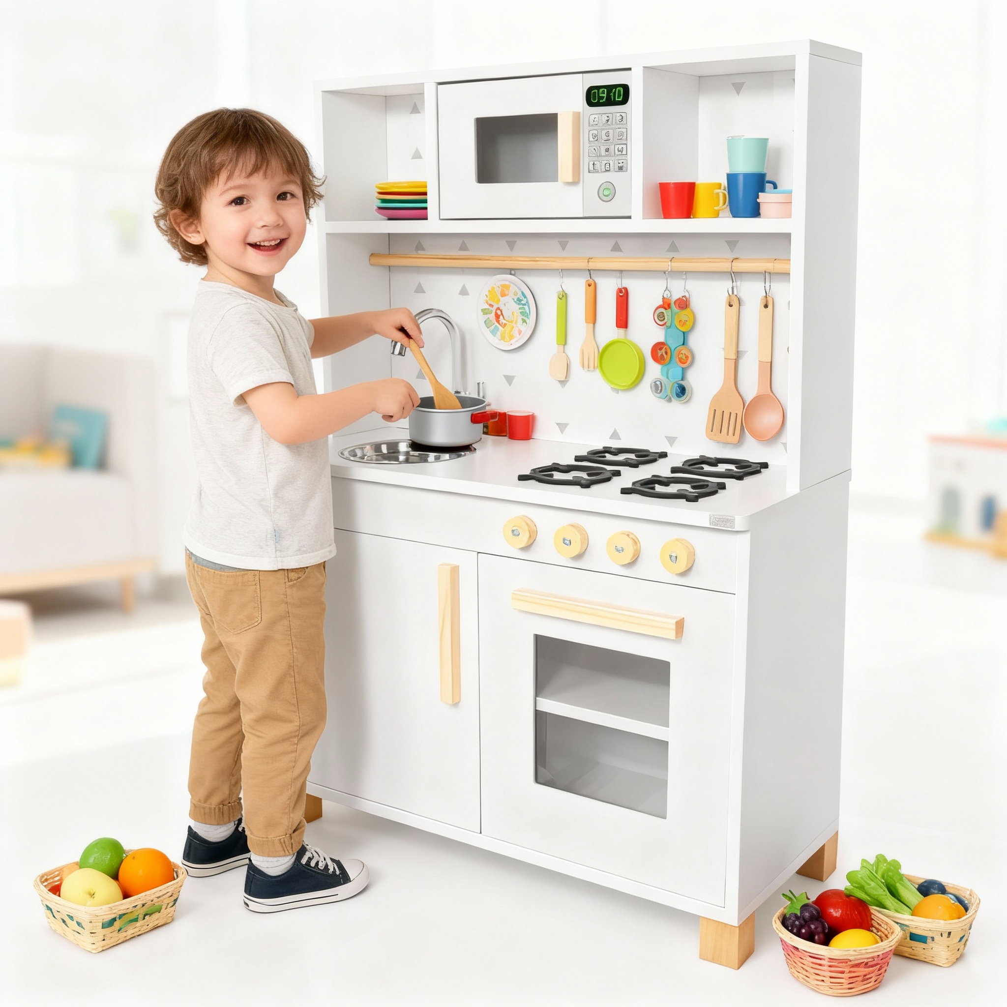 Medindo 1,00m de altura x 0,72m de largura x 0,30m de profundidade, esta cozinha de brinquedo é completa: conta com fogão de quatro bocas, forno, micro-ondas, pia com torneira metálica e prateleiras organizadoras, tornando a brincadeira ainda mais realista.