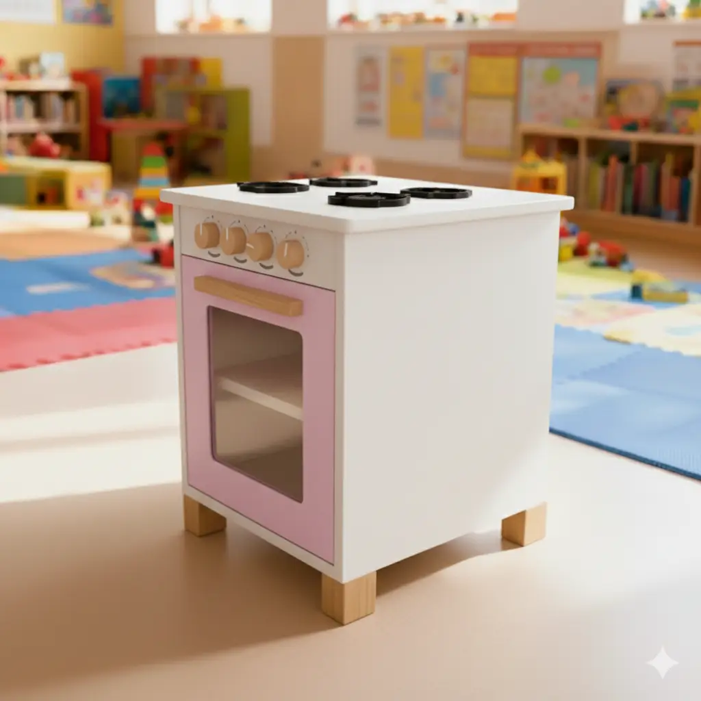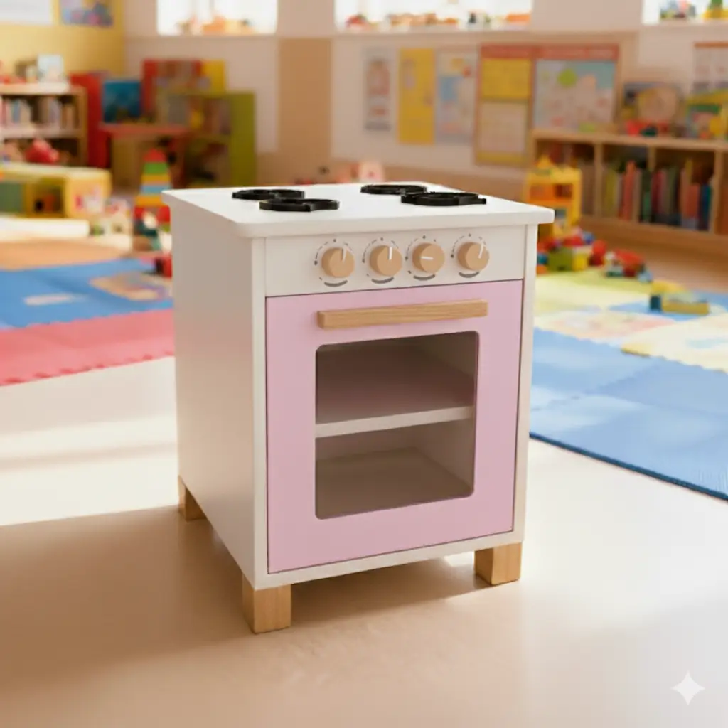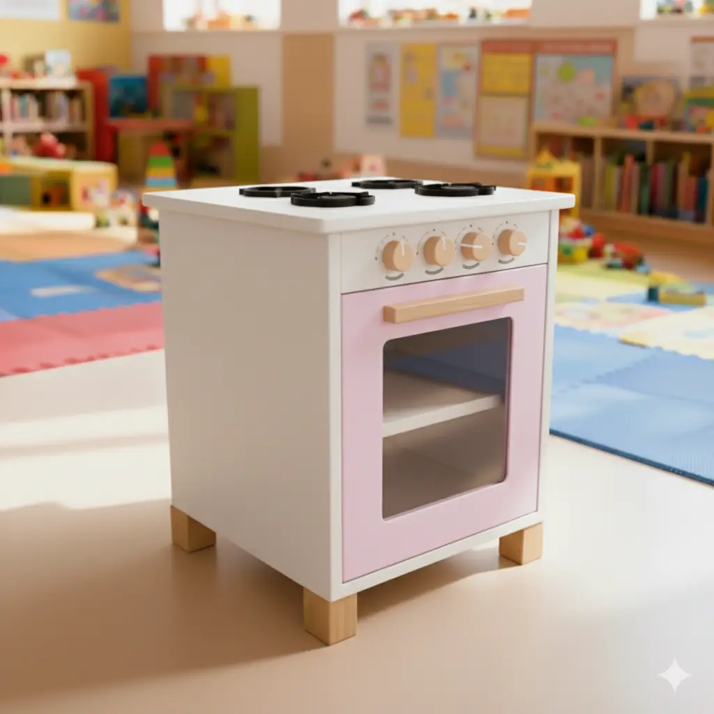 Produzido com madeira de reflorestamento e pintura atóxica, o fogão combina design realista, acabamento premium e segurança, ideal para crianças a partir de 2 anos.