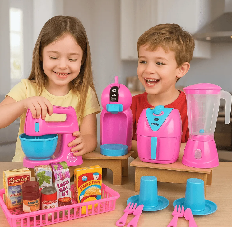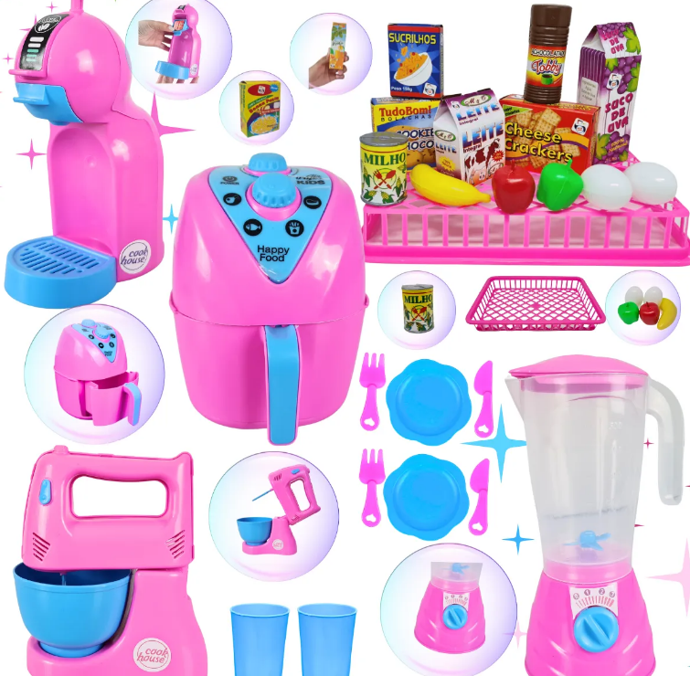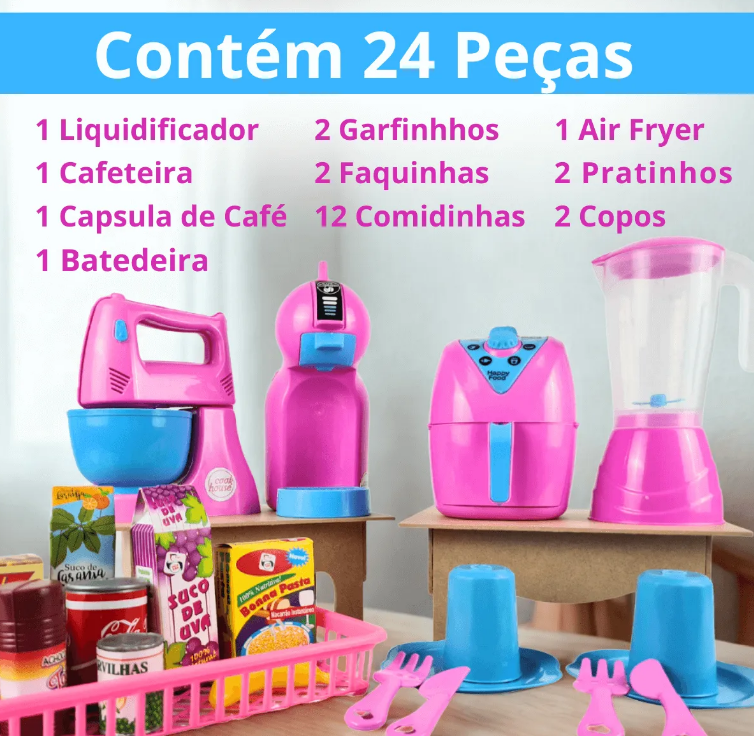 Kit Cozinha Brinquedo Eletrodomésticos + Comidinhas – 24pcs Rosa