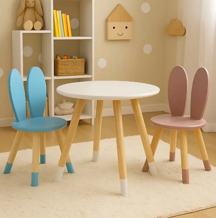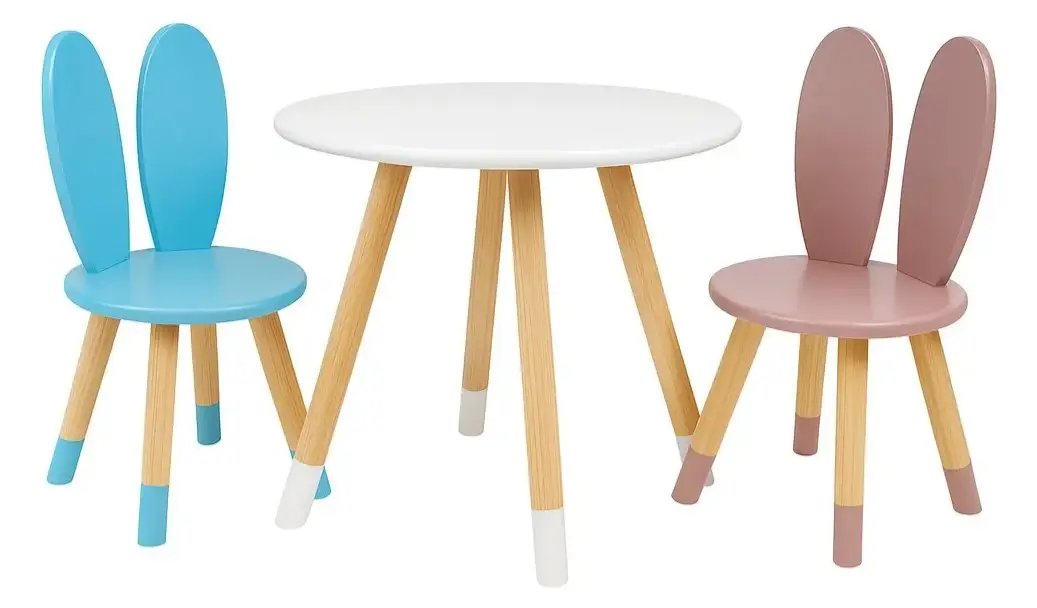 Conjunto infantil encantador de mesa redonda com cadeiras em formato de coelho, perfeito para estimular a criatividade e o aprendizado das crianças. Produzido com madeira de pinus de alta qualidade e MDF de 15 mm, este conjunto garante durabilidade e resistência, ideal para o uso diário.