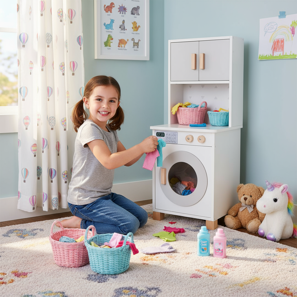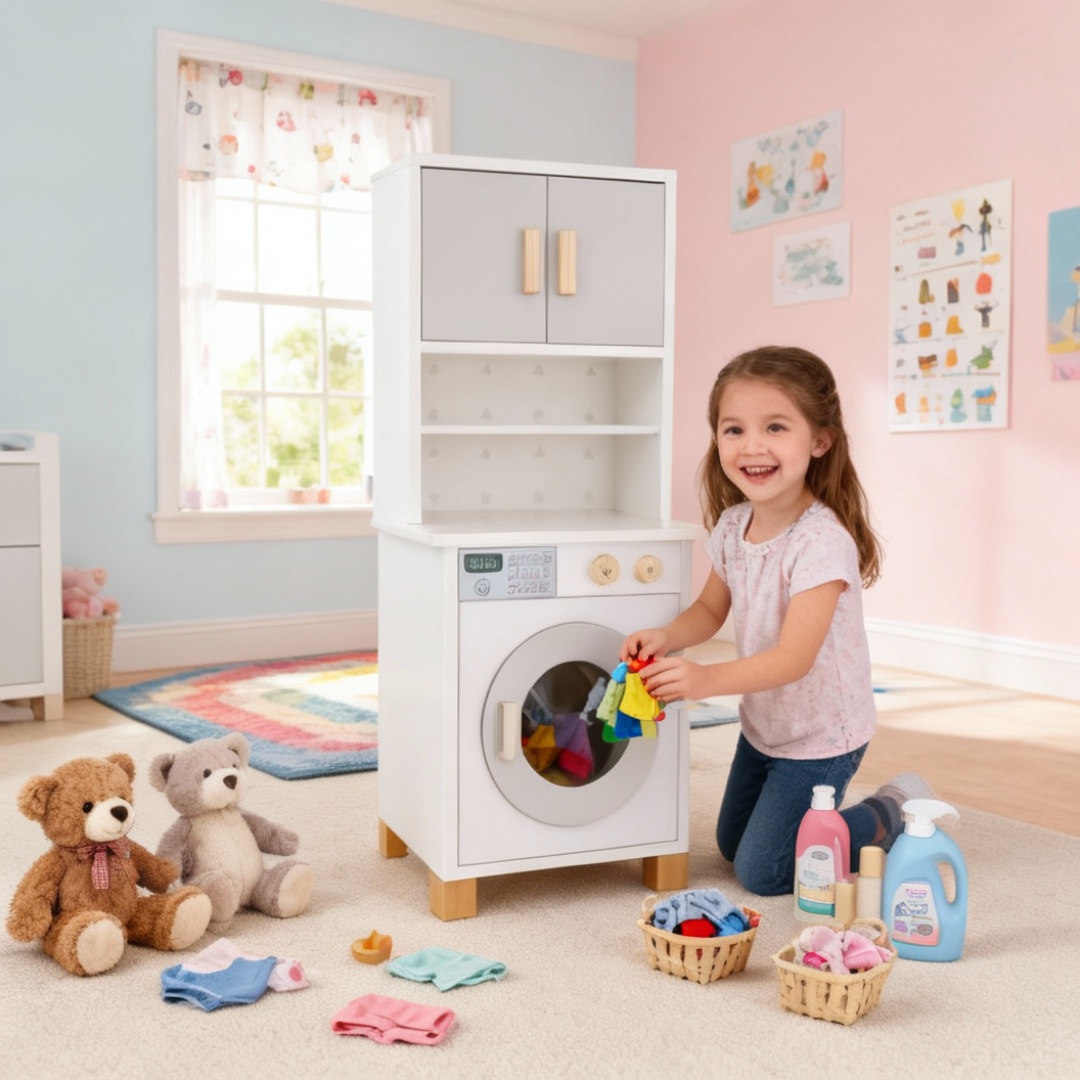 Com detalhes realistas, botões interativos e compartimentos funcionais, a mini lavanderia ajuda no desenvolvimento da imaginação, coordenação motora e nas brincadeiras de imitação do dia a dia. Além de ser um brinquedo encantador, também é um móvel decorativo que deixa o ambiente infantil ainda mais especial.
